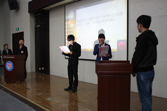 本次活动以“徜徉文化知识,秀出青春年华”为主题,题目涉及历史、地理、文学、生活常识等多方面内容。全校共有200多名选手报名,经过初赛复赛的激烈比拼,共选拔出10名同学入围决赛。决赛是一对一比拼,以攻守擂,抽签决定比赛顺序。攻守双方轮流答题,20秒内未答出既被淘汰。比赛现场,还有校园十佳歌手即兴助唱、微信抽奖、观众互动让活动更加丰富多彩。最后,经过两个多小时的智慧碰撞,机电工程学院的何健获得冠军,交通工程学院的郭清、电子学院的汪金亮分获第二、三名。