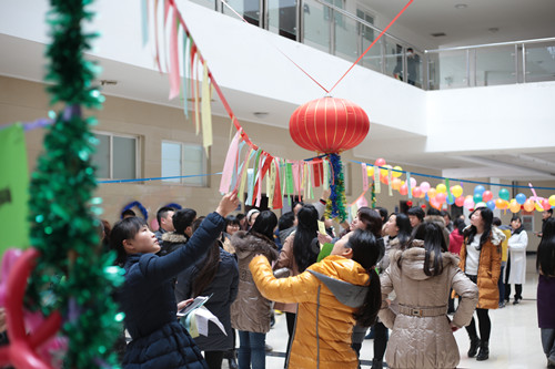 活动现场,五色彩带和各种形状的气球装点了整个活动大厅,许多写满灯谜的卡片挂在彩带上。下午2:00,活动正式开始。教职工们积极参与,不到40分钟,挂满大厅的谜面条就被大家“抢”空了。灯谜谜面难易程度不一,有的让老师们不假思索写出答案;有的富有挑战性让老师们大费脑筋。老师们或独自思索,或三五成群在一起热烈讨论……欢乐祥和的氛围弥漫全场。