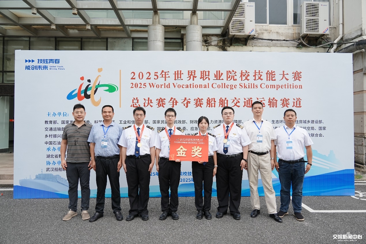 新闻网讯(通讯员 倪志斌)8月25日,2025年世界职业院校技能大赛船舶交通运输赛道(高职组)在武汉船舶职业技术学院圆满落幕,我校航运学院学生夏清涛、胡铭悦、方思能、张银波在吴飞、李志特老师的指导下斩获金奖,夺得今年我校参赛队伍中的“首金”。