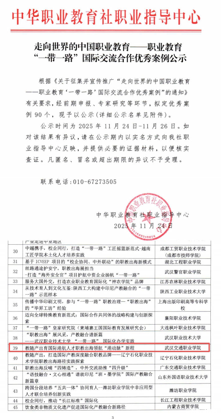 案例立足学校港航专业特色,紧扣“一带一路”倡议人才需求,以“教随产出”为核心导向,构建了适配海外市场的港航技术技能人才培养体系,为向合作地区定向输送高素质人才奠定坚实基础。此次入选是对学校国际化办学成果的高度认可,彰显了在“职教出海”领域的示范引领作用。