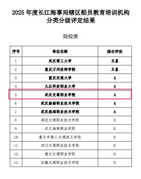新闻网讯(记者 魏小双)近日,长江海事局正式发布2025年度辖区船员教育培训机构分类分级评定结果,学校凭借扎实办学底蕴、规范管理体系、过硬培训质量与突出行业服务能力,办学以来首次成功获评A类船员培训机构。这一重磅荣誉,标志着我校船员培训综合实力正式跻身长江海事局辖区第一梯队,成为长江流域航运人才培养的核心力量之一。