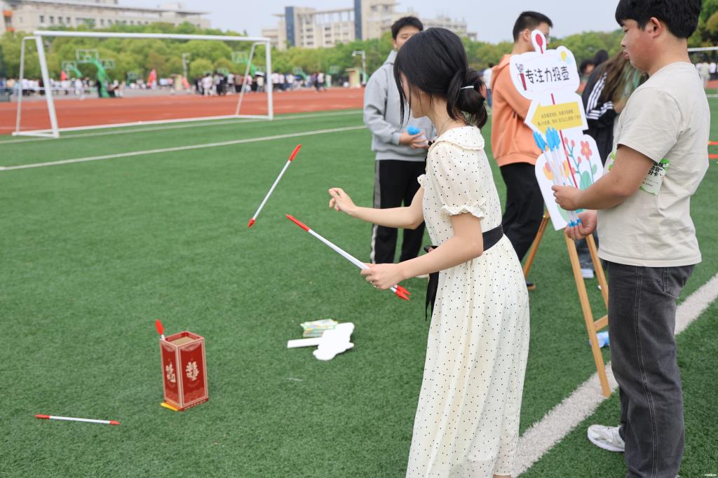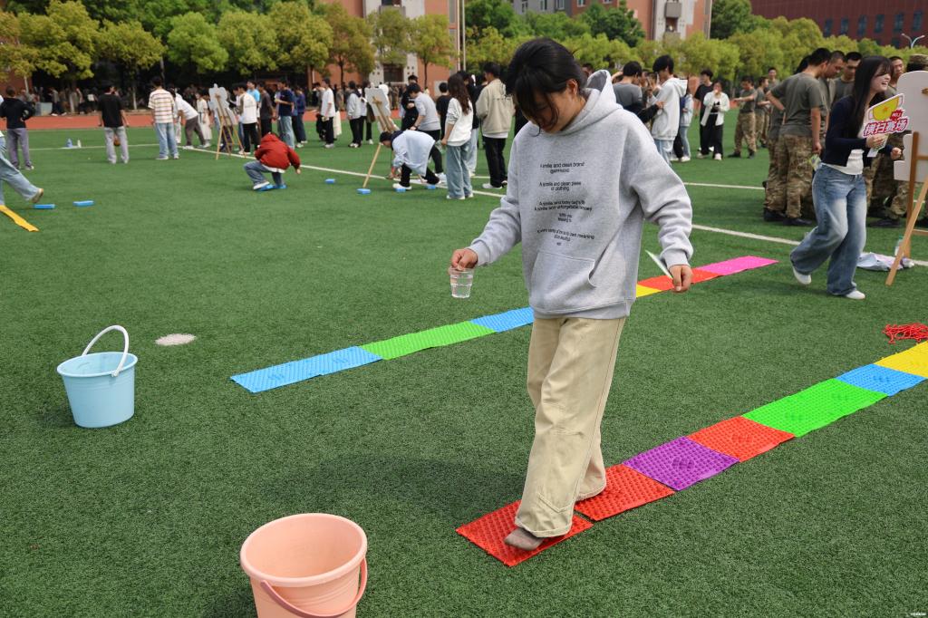 运动会设置个人挑战、团队协作及师生同心三大板块,在个人挑战区,运动氛围张弛有度。“摸石头过河”赛道上,同学们双脚各踩一块瑜伽砖,手持第三块瑜伽砖交替前铺、移步换转。有人重心不稳,慌忙挥臂保持平衡,引得围观同学阵阵惊呼;有人节奏沉稳,三步并作两步快速抵达终点,额角汗珠与脸上笑容相映成趣。“指压板运水”区域,同学们手持水杯在凹凸不平的指压板上稳步前行,杯中的水花随着脚步轻轻晃动,映出他们咬牙坚持的模样。广受欢迎的“逐浪保龄球”场地旁,同学们奋力掷球,“砰”的一声撞到一排矿泉水瓶,欢呼声与掌声瞬间响起,压力仿佛也随着清脆的撞击声消散。与之形成鲜明对比的“专注力投壶”区域则格外安静,参与者屏气凝神,目光锁定前方的投壶筒,手腕轻抖间,箭矢划出一道优雅的弧线,“叮”地一声落入壶中,在动静转换间培养“水滴石穿”的专注力,助力学生实现多维度心理成长。