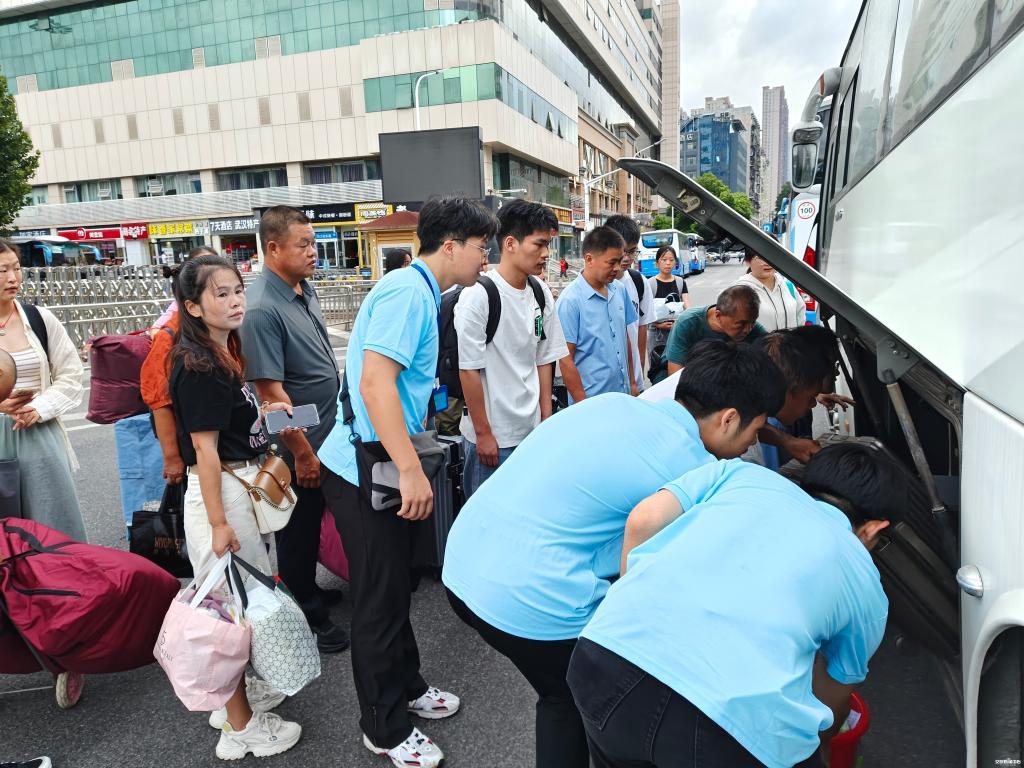 “来,我帮您拿行李,先前往我们的服务点休息一下,等接站车来了统一出发。”