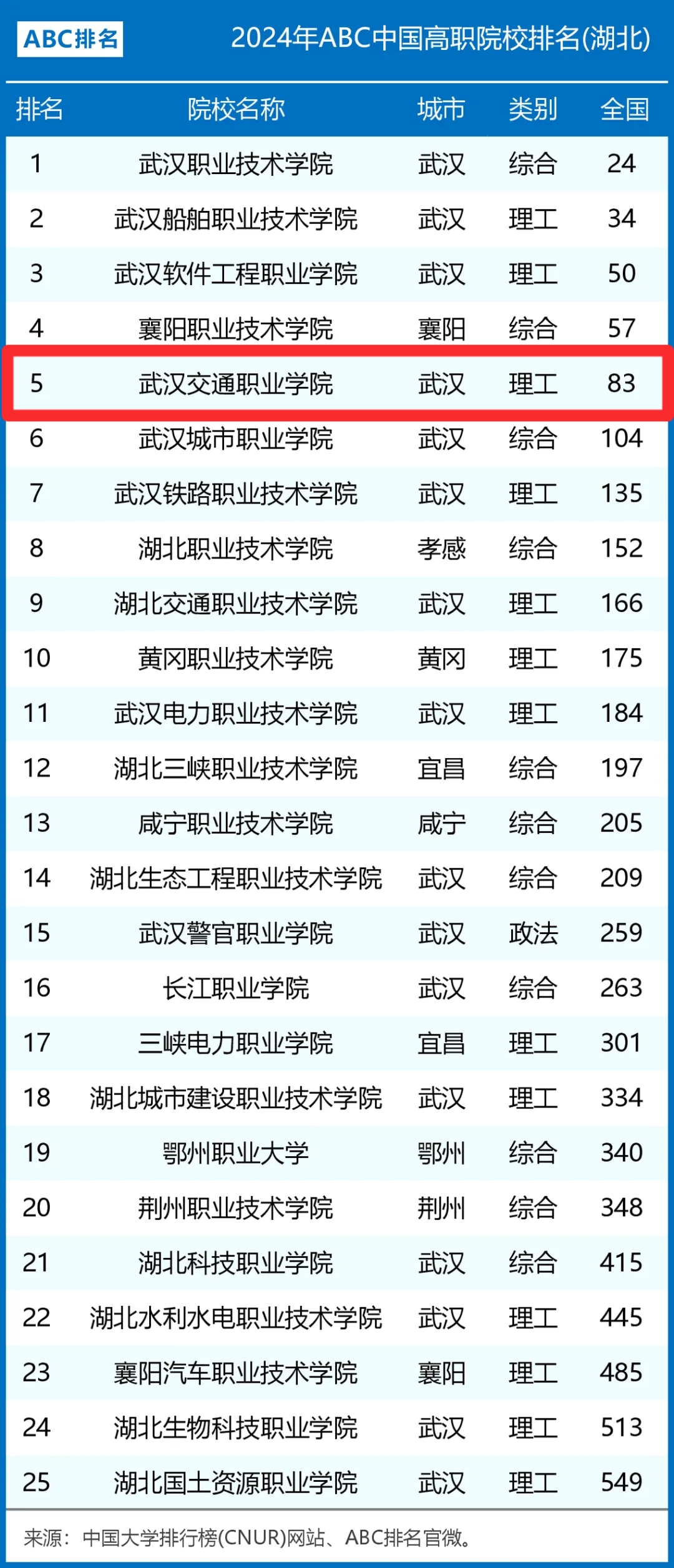 新闻网讯(记者 汪云凤)5月22日,中国大学排行榜网站正式发布2024年ABC中国高职院校排名,我校位居全国第83名。与2023年相比,全国排名上升115名。5月23日发布的各省高职院校排行榜中,我校位居湖北省第5名。