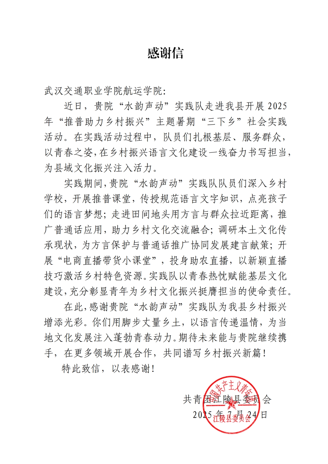 新闻网讯(记者 王同祥)7月24日,武汉交通职业学院航运学院“水韵声动”实践队收到来自共青团江陵县委员会的一封感谢信。这不仅是对实践队员们在活动期间辛勤付出的肯定,更是青年学子将理论联系实际、在实践中锤炼成长的有力见证。