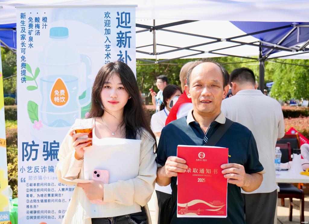 “同学,办完报到手续记得来领一杯酸梅汤,降温又‘避坑’!” 在艺术设计学院迎新点,志愿者们手持装满酸梅汤的纸杯,热情地向新生们递去。不同于普通的饮品,这些酸梅汤的杯身设计暗藏“玄机”——由学院学生自主设计的防骗小贴纸格外醒目,“未知链接不点击,陌生来电不轻信”“转账之前多核实,遇事不慌先报警”“南瓜冬瓜和西瓜,不要被骗做傻瓜”等有趣的防骗提醒语,配上生动可爱的卡通图案,既展现了艺术学子的创意风采,又将防诈骗知识以轻松易懂的方式传递给新生。