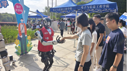 不仅是专业老师,移动机器人也争相炫技,为新生展现科技的魅力。人形机器人时而与新生握手互动,时而摆造型与新生合影留念;机器狗也翻着跟斗给新生撒娇卖萌。