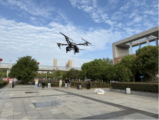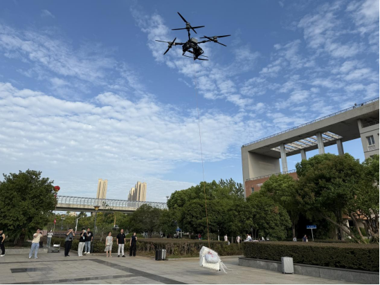 清晨,迎新现场早已准备就绪。在众多迎新服务点中,一支由2024级无人机应用技术专业学生组成的志愿服务队格外引人注目。他们操作大型无人机,主动为行李繁重的新生提供便捷运送服务。来自25无人机专业的新生赵鑫超成为首位体验无人机行李搬运的同学。他的父母一路陪同,带着大件行李抵汉,正在发愁如何搬运时,24无人机专业的程建栋和肖雨婷等人热情迎上前,协助他们将行李稳妥地固定在无人机吊舱中。当无人机平稳升空、精准飞往目的地时,现场顿时响起一片惊叹与掌声。许多家长和新生纷纷举起手机记录这一刻,既惊喜于科技带来的便捷,也更直观地感受到智能制造的专业魅力。