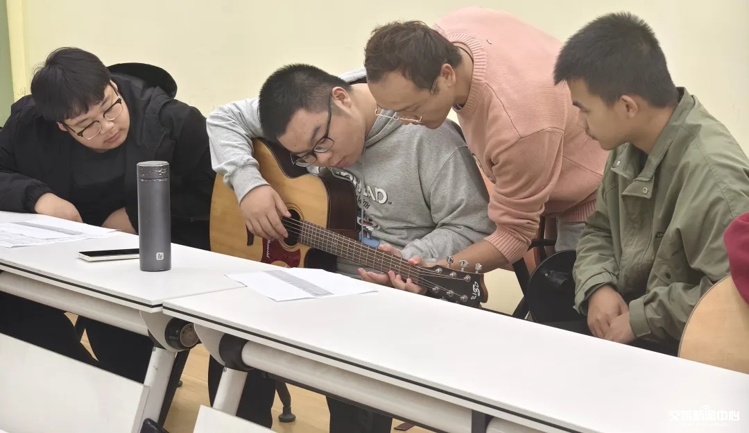 在实践环节,同学们跃跃欲试,纷纷拿起吉他尝试弹奏。汪老师耐心地进行一对一指导,从指法到节奏,细致地纠正每一个细节,让大家在体验中感受音乐的魅力。整个过程中,音乐的旋律与欢声笑语交织,现场气氛温馨而热烈。