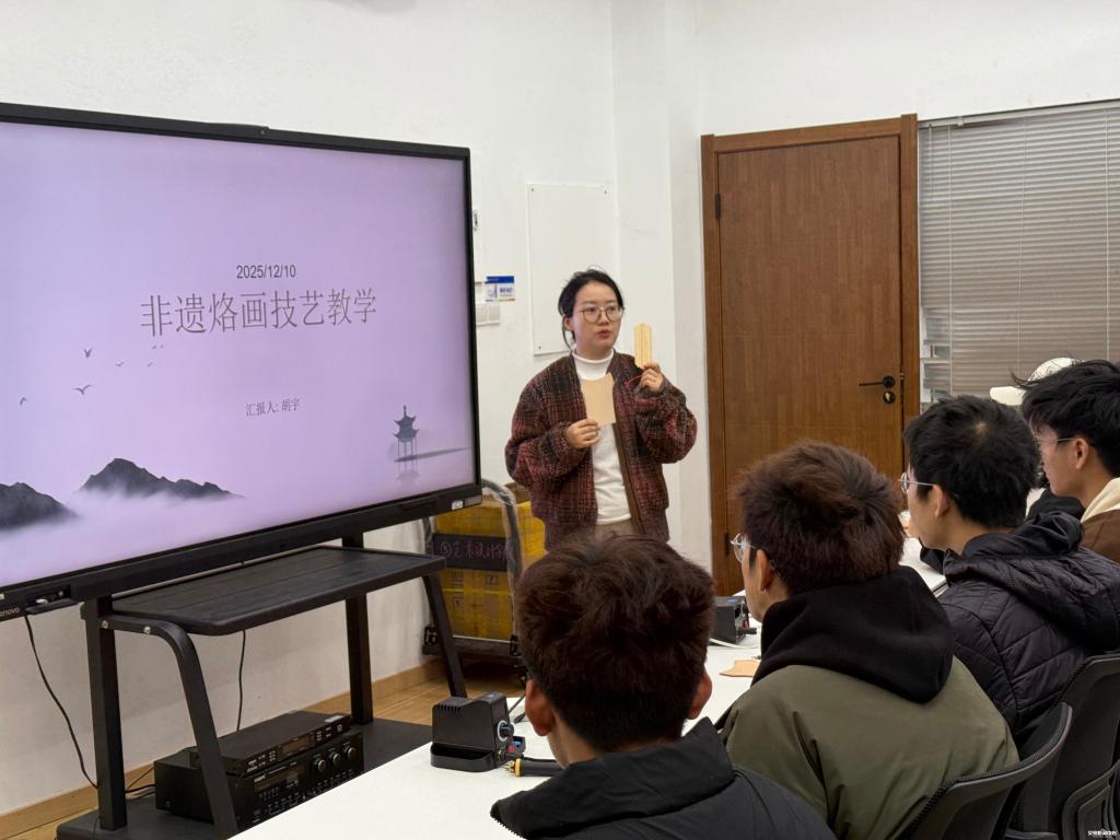 新闻网讯(记者 张雨驰)12月10日,艺术设计学院“非遗工坊”负责人胡宇老师走进水韵舟行社区在“景型课堂”开展传统文化讲座与烙画教学交流活动,让学生近距离感受传统艺术魅力。活动现场,胡宇老师率先示范烙画技法。她手持烙笔在木板上自如挥洒,随着烙笔的移动,一幅山水烙画渐次成型。
