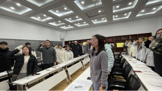 “我志愿加入中国共产主义青年团……” 全体团员在团支书的带领下高举右拳,重温入团誓词,铿锵誓言坚定理想信念,凝聚奋进力量。