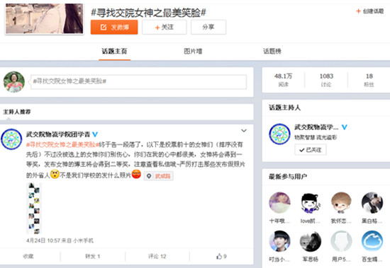 14日,物流学院团学青新媒体部在临湖轩侧门摆点宣传,“寻找交院女神”六个大字引得同学们驻足关注,都纷纷拿起手机通过微博参与活动。截至4月17日,话题量关注到达48.1万,1083人参与了话题的讨论,584人进行了转发,200人在微博上上传了他们心目中交院女神的照片。24日,物流学院利用第三方抽奖平台随机抽取了十位转发话题的幸运博主,同时组织新媒体部门以公平公正的方式评选出了40位女神图片供大众投票。经过一个星期激烈紧张的投票,刘丹、刘雁菲、江长安、蒋凌萌等十位同学用她们快乐、自信、美丽的笑脸征服了大家,脱颖而出获评“最美女神”称号。