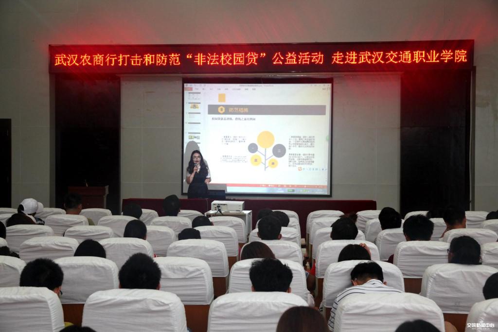 在播放了由湖北省银监局制作的专题教育片《整治非法校园贷湖北在行动》后,武汉农村商业银行个人业务部副经理易筱君为同学们做了一场高水准的演讲。她详细介绍了“非法校园贷”的现状与形式,分析了校园贷的诈骗套路,告诉同学们“非法校园贷”的影响及危害,并通过案例分析,向同学们讲解了“非法校园贷”的防范措施。