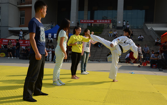 “记得马步要扎稳,掌握力度,这样才能既不吃力又达到效果”,跆拳道协会的“摊位”前,一位身着跆拳道道服的黑带教练正在现场教授大一新生近身防身术。这位黑带教练是武交院跆拳道12级学生胡童,前几日得知社团开始招新,他专门返校为社团招新助力。