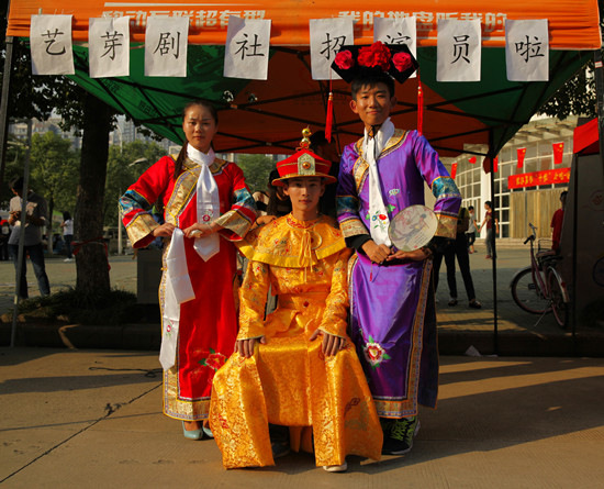 高颜值的皇上、一米八的“皇后”、娇俏的贵人……“哇,你们看,这个皇后是男生啊!”说完,人群中一阵爆笑,“你好美呀”“学长勇气十足呀”“可以一起拍个照吗”,在社团招新现场,艺芽话剧社学长学姐们的反串表演获得了同学们的亲睐。