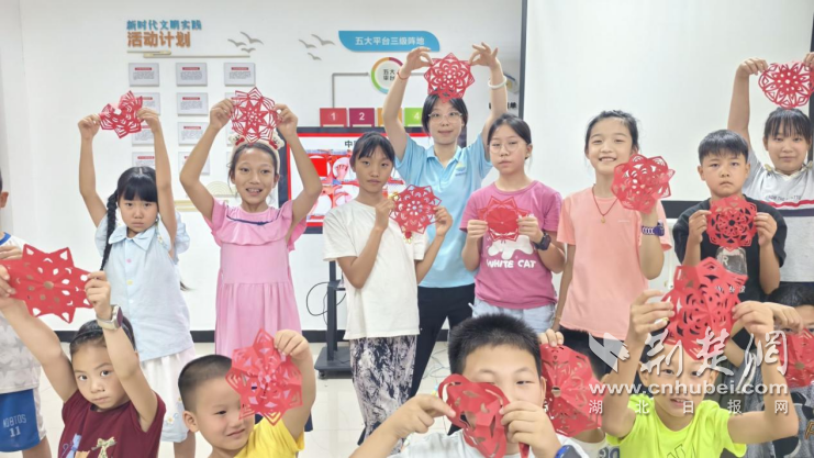 荆楚网(湖北日报网)讯(记者齐一璇 通讯员邓俊芬)“咔嚓、咔嚓——”一把小剪刀在红纸间穿梭,像一只灵巧的红蜻蜓,抖落出一串碎屑,也抖落出孩子们此起彼伏的惊叹。7月18日,枝江市顾家店社区的活动室被暖黄色灯光和稚嫩笑声填得满满当当,武汉交通职业学院“小候鸟”志愿服务队的“非遗微课堂”在此开讲。王佳和姜曼清两位“05后”老师,把剪纸和脸谱从博物馆“搬”到乡村课桌,让三十多名“小候鸟”过足了“小小非遗传承人”的瘾。