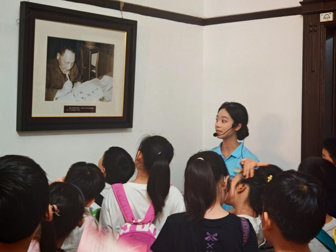 下午,八七会议会址纪念馆内,历史的厚重与青春的活力交织成独特的画面。团队成员陈依锐伫立在八七会议会址的二楼,目光炯炯地投向那复原的会场,手指有力地指向当年代表们围坐的桌椅,声音里带着穿越历史的回响,慷慨激昂地讲述:“小朋友们,我们现在来到的地方是整个会址的关键区域,1927年的这个夏天,正是在这里,先辈们用热血抉择点亮了革命的新航向。”她特意放慢语速,让孩子们能跟上历史的脉搏,时不时抛出“如果当时你是参会代表,会提出什么建议”的问题,引得小讲解员们争相举手。