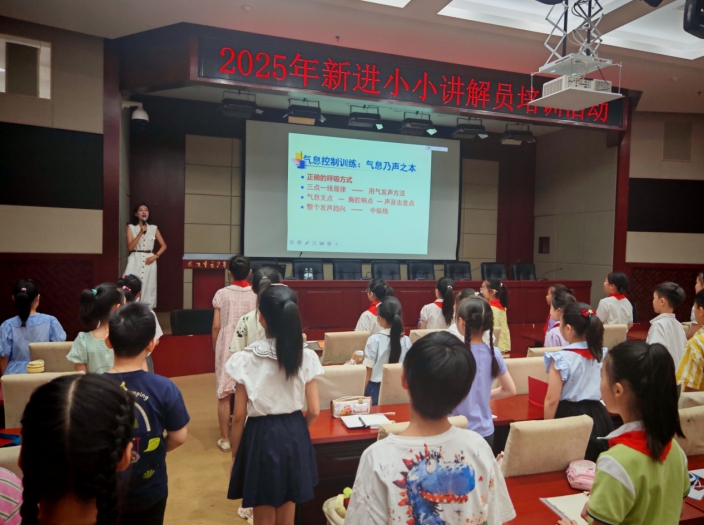 培训现场暖意融融。志愿者们分工明确,有的引导孩子们有序签到,有的举着相机蹲低身子,捕捉孩子们仰头聆听讲解技巧的专注神情,还有的穿梭在教室间分发气息训练图谱。“老师,这个发声练习怎么做呀?”一个扎着羊角辫的小姑娘举着训练表问,志愿者黄棋立刻俯身教她“三点一线”的用气方法,阳光透过窗户落在两人笑脸上,成了红色课堂里最暖的剪影。