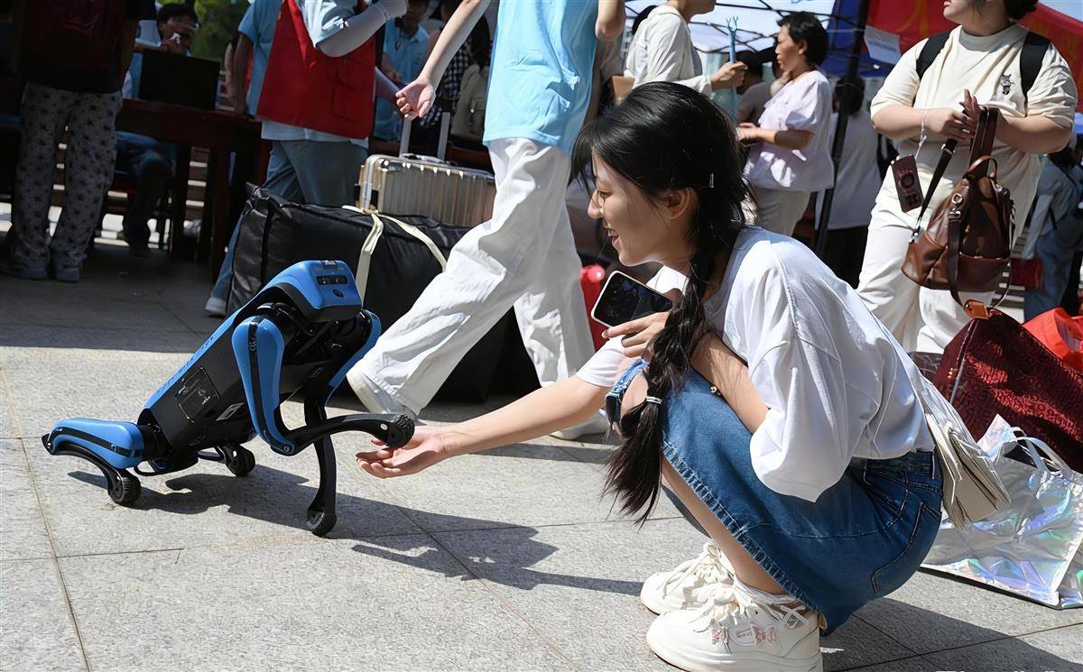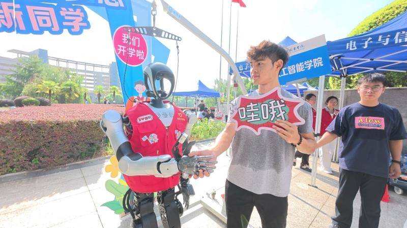 在武汉交通职业学院校园,宛如一座移动科技展馆:空中,无人机轻盈穿梭,精准将新生行李从校门口递送至宿舍楼下;地面,身披红色志愿者马甲的机器人主动伸出“机械臂”与新生握手问好,活泼的机器狗则摇着“身子”在人群中跳跃,引得新生纷纷驻足拍照;广场上,一组人形机器人随着音乐整齐起舞,动作流畅划一,现场欢呼声与赞叹声不断。