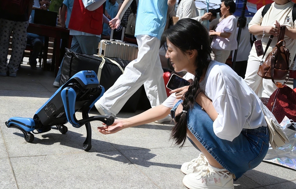 无人机在空中轻盈穿梭,精准递送行李;机器人披着志愿者红色马甲,主动伸出“手臂”与新生“亲切握手”;活泼的机器狗摇着“身子”在人群中灵动跳跃,引来阵阵欢笑;还有一群人形机器人随着音乐节奏集体起舞,动作整齐划一。整个校园仿佛变身科技展馆,新生们好奇地驻足、互动,不时发出欣喜的赞叹,现场科技感扑面而来。