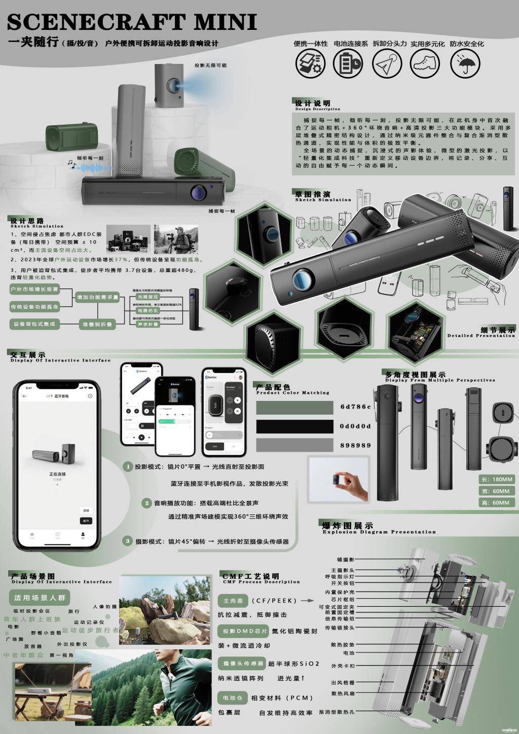 该作品聚焦户外徒步人群使用痛点,以“捕捉每一帧,倾听每一刻,投影无限可能”为设计初心,首次将运动相机、360°环绕音响与高清投影三大功能模块融合,以“轻量化集成科技”重新定义移动设备边界。获奖学生张宇航介绍,作品落地经历3次关键原型修改,“最关键的是‘磁吸设计的充电部分’,将市面上产品原有的充电口改到两节圆柱中间,既满足充电需求,又实现可拆卸、轻量化,大大提升产品竞争力”。