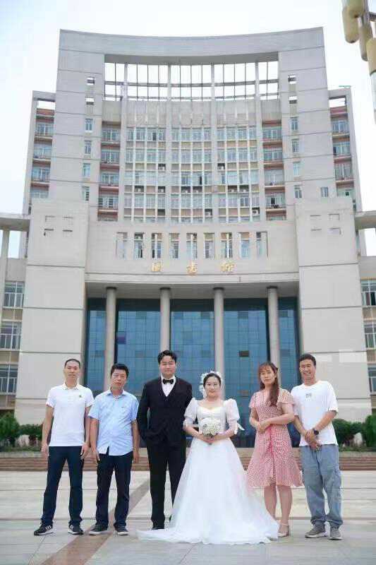 图书馆前合影,左起:学院团总支书记、新娘父亲、新郎、新娘、新郎辅导员、新娘辅导员