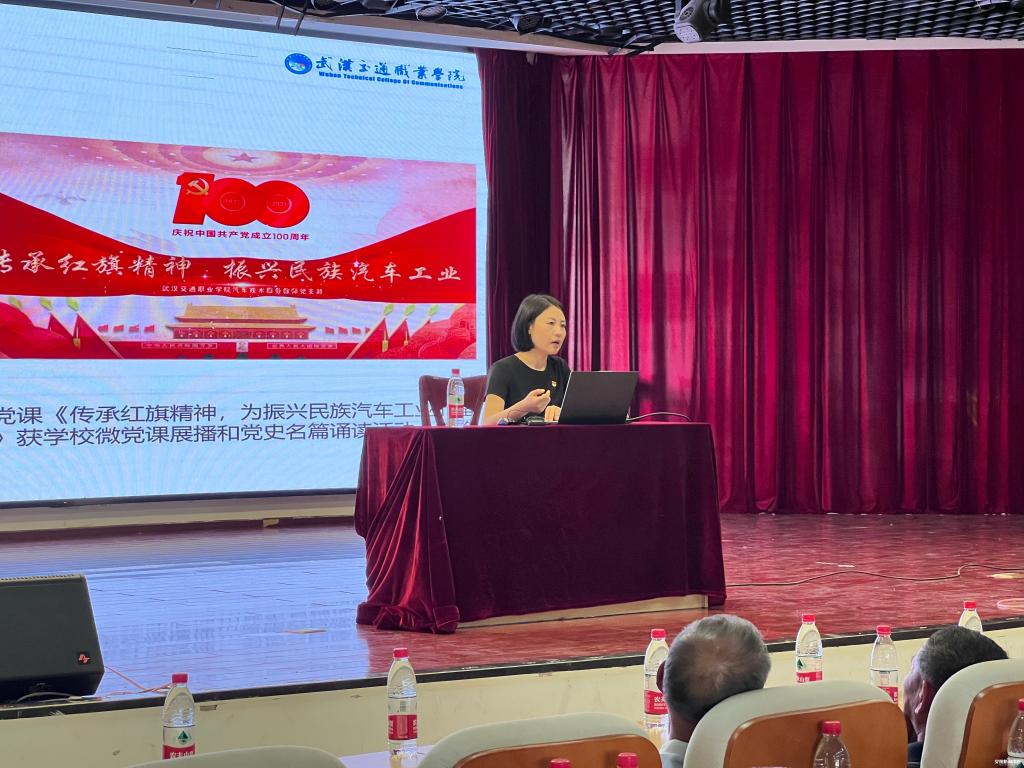 6月14日,武汉市洪山区黄家湖社区携手武汉交通职业学院开展“主题党课我来讲”活动。本次党课特邀武汉交通职业学院汽车学院汽车技术服务教师党支部书记史婷主讲。史婷老师从教师党支部书记和专业带头人的双重身份出发,围绕党建和业务两方面工作进行讲解。黄家湖社区党总支书记马丽君、副书记李先梅与社区30余位党员代表,武汉交通职业学院汽车学院党总支书记金松鹤、汽车学院辅导员、学生党员代表及入党积极分子等参加活动。