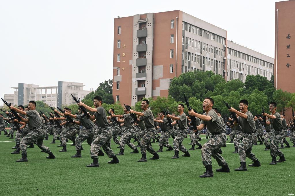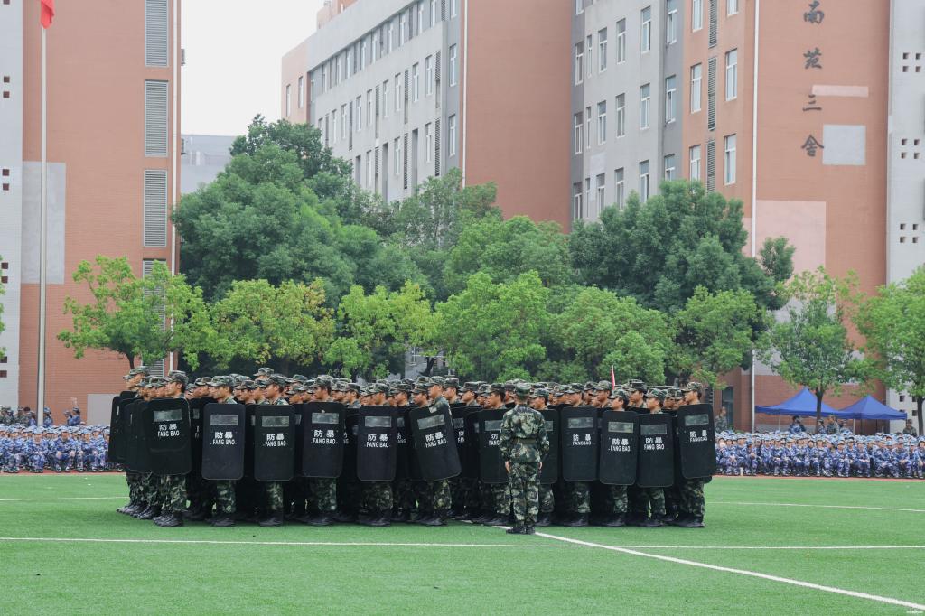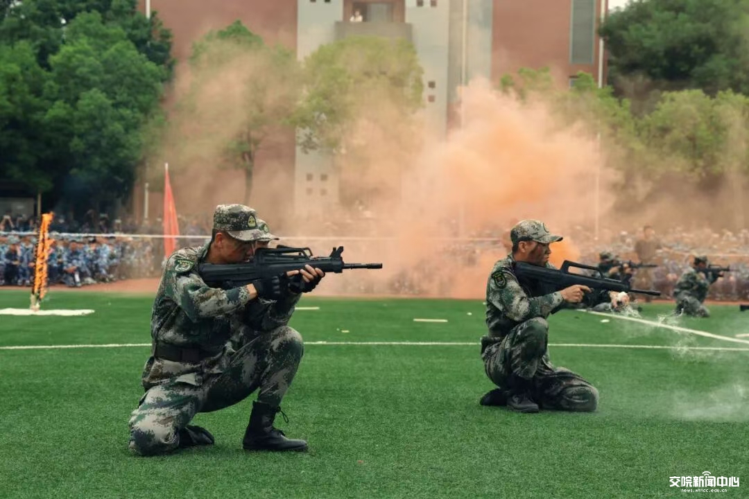 全体新生进行军训成果展示。各学院方阵喊出的铿锵口号响彻武交院上空。