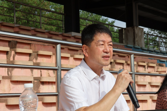 学校党委书记杨震讲话。他代表学校对军士学院694名2025级新学员的到来表示热烈欢迎,向全体承训老师和教官致以诚挚问候与感谢。他指出,今年正值纪念中国人民抗日战争暨世界反法西斯战争胜利80周年,作为未来强军事业的后备力量,军士生要从历史中汲取力量,把个人成长与国防建设紧密结合,以军训为起点筑牢责任担当。