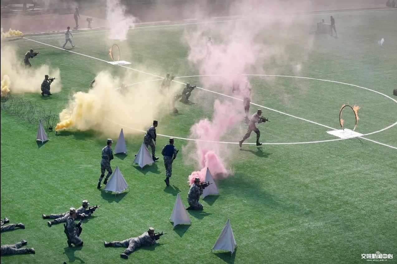 “现在给大家展示的是步兵班进攻战斗!”学校南苑运动场“硝烟”弥漫,充溢着紧张浓厚的战场氛围。在学校2024新生开学典礼暨军训表彰大会上,军士学院战术综合演练课目汇报表演燃爆全场。红方步兵班隐蔽接敌,他们不断变换战斗队形,交替掩护前进,以跃进、匍匐方式迅速通过敌障碍区。时而跪姿据枪,时而卧倒匍匐,令人热血沸腾。在突破敌前沿后,数架无人机直插敌阵地纵深实施侦察,确认敌火力点位置,并对敌暗堡、指挥所实施投弹。战士们奋勇争先,攻入敌阵地,与敌人拳脚相向、刺刀见红、搜清残敌。